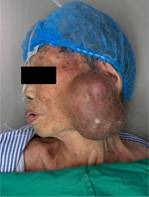 Cụ bà L.T.C nhập viện trong tình trạng có khối u lớn vùng mặt bên trái, gây đau, biến dạng khuôn mặt và ảnh hưởng nhiều đến sinh hoạt trong suốt nhiều năm. Kết quả sinh thiết xác định đây là ung thư biểu mô tế bào đáy dạng tuyến nang (adenoid type) - một thể hiếm gặp của ung thư da.