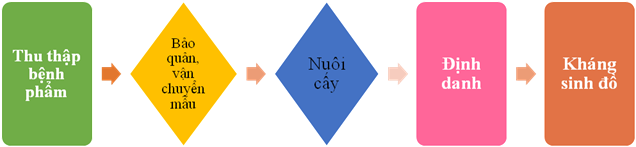 Quy trình nuôi cấy, định danh tìm vi khuẩn gây bệnh và thực hiện kháng sinh đồ gồm các bước: