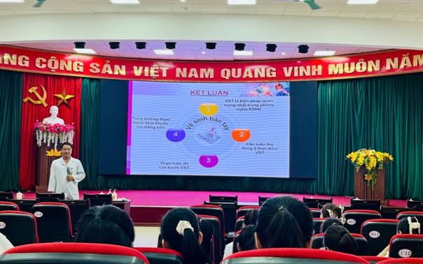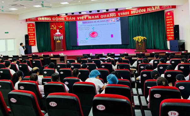 Chiều ngày 08/10/2025, nhằm cung cấp, cập nhật kiến thức và kỹ năng chuyên môn cho nhân viên y tế, Bệnh viện Ung bướu tỉnh Thanh Hóa đã tổ chức lớp tập huấn và phát động chương trình Vệ sinh tay năm 2025 với chủ đề Găng tay không thay thế vệ sinh tay dành cho bác sĩ, điều dưỡng đang công tác tại Bệnh viện. Buổi tập huấn có sự tham gia của các cán bộ, bác sĩ, điều dưỡng, nhân viên y tế trong Bệnh viện cùng tập huấn viên là ĐDCKI. Nguyễn Đình Vinh - Trưởng khoa Kiểm soát nhiễm khuẩn.