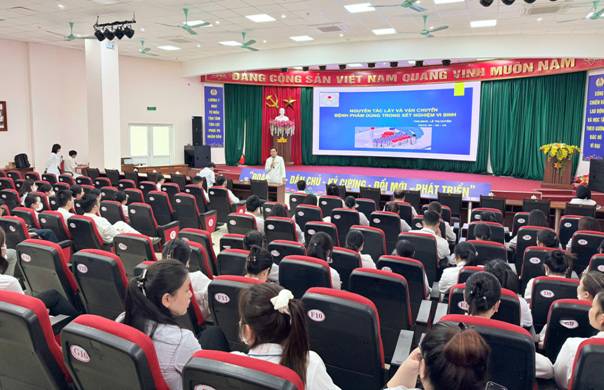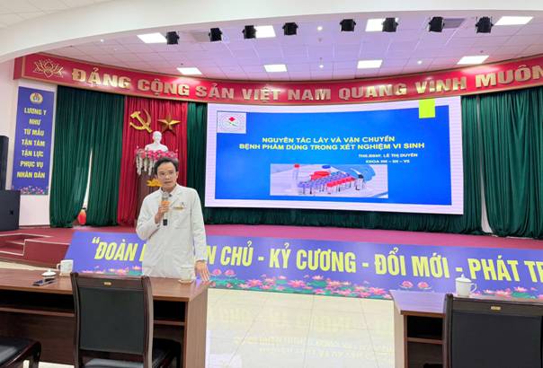 Tiếp nối chương trình, CKI XN. Lê Ngọc Vũ - Khoa HH - SH - VS, trình bày chuyên đề "Lấy, bảo quản và vận chuyển các loại mẫu bệnh phẩm xét nghiệm". Báo cáo đi sâu vào quy trình chuẩn từ khi thu nhận mẫu, ghi nhận thông tin, bảo quản đúng điều kiện đến vận chuyển an toàn sang khoa xét nghiệm như: