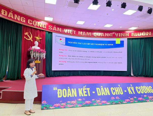 Ảnh: ThS.BSNT. Lê Thị Duyên, Khoa HH - SH - VS trình bày chuyên đề "Nguyên tắc lấy và xử lý bệnh phẩm dùng trong xét nghiệm vi sinh".