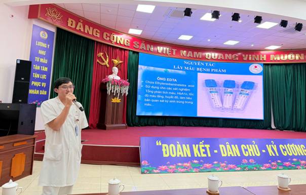 Ảnh: CKI XN. Lê Ngọc Vũ Khoa HH - SH - VS, trình bày chuyên đề "Lấy, bảo quản và vận chuyển các loại mẫu bệnh phẩm xét nghiệm"